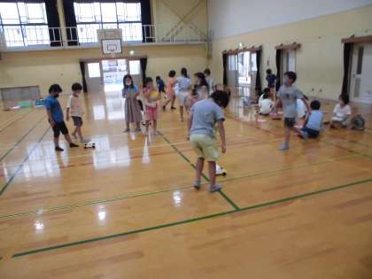 理科の学習で体育館を使って実験をしました。今日は,風で動く車をうちわや送風機を使って動かし,風の強さと車の動く距離との関係を調べました。