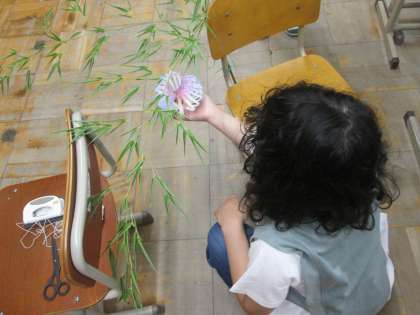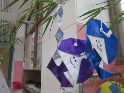 七夕飾りを作りました。折り紙の折り方を調べて,管理用務員さんに用意してもらった笹にかわいらしく飾り付けをすることができました。