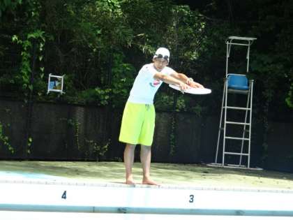 K先生がビート板の使い方やバタ足の仕方を指導しています。