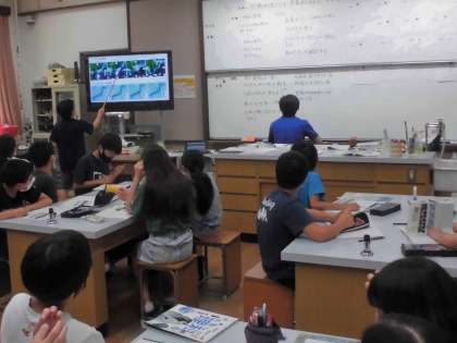 理科では台風について学習しています。今日は、教科書や先生が用意した資料を使って、台風の動きと台風に伴う天気の変化について調べました。そして、資料から分かることをグループや全体で話し合い、考えていきました。