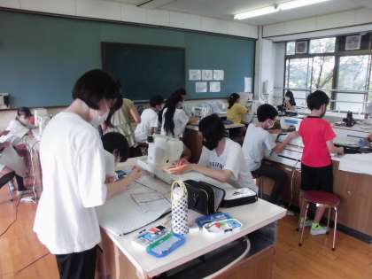 家庭科ではナップザック作りに取り組んでいます。今日は、「口あき止まり」をミシンで縫う学習を中心に行いました。ミシンの扱いにも慣れた様子で、比較的スムーズに縫うことができました。