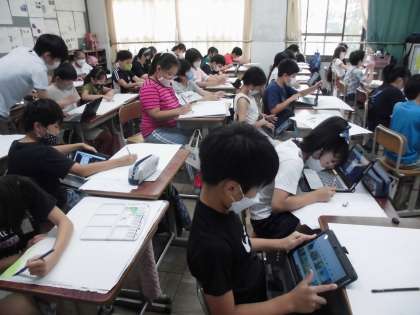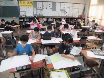図工で、「まほろばトリップ」というお話の絵に取り組んでいます。子どもたちが飛鳥時代にトリップするというお話で、一人一人ギガ端末に調べたいものを画像で取り込み、それを参考にしながら下がきをしました。