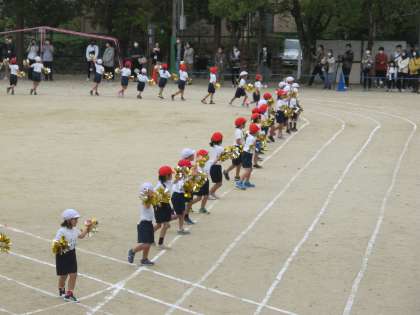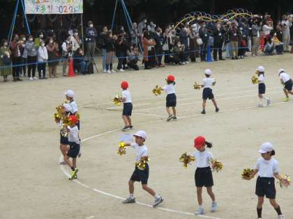 初めての団体演技でした。手にポンポンをつけて元気に踊っていました。ツバメの尻尾を思わせるような手の動きがかわいかったです。