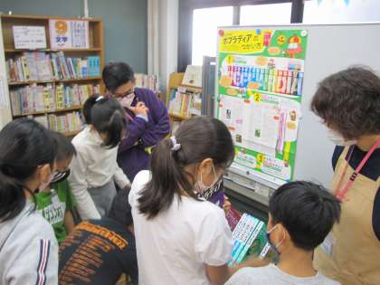 学校司書の先生に、百科事典と国語辞典の違いや百科事典の使い方などを教えてもらいました。その後、百科事典で調べる実践として、「星座のおおいぬ座の中で一番明るい星は何?」や「すじこは何の魚のたまご?」などの問題に取り組みました。