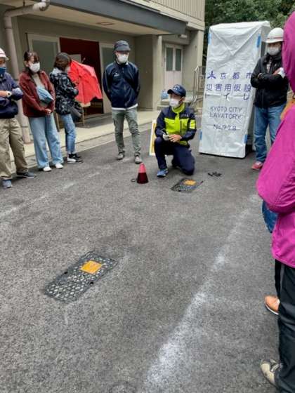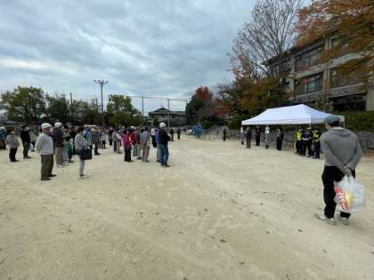 11月13日(日)9時15分より、宇多野自主防災会主催の防災訓練が3年ぶりに開催されました。オープニングでは、右京区長・右京消防署長方が挨拶をされ、50周年記念のくす玉が割られました。各町内からの参加者は、3つのグループに分かれ、土嚢詰め、AEDを使った心肺蘇生法、昨年度完成したマンホールトイレの設置方法等を体験しました。