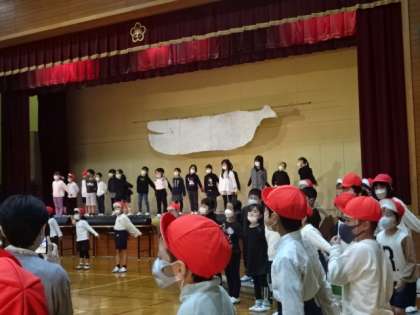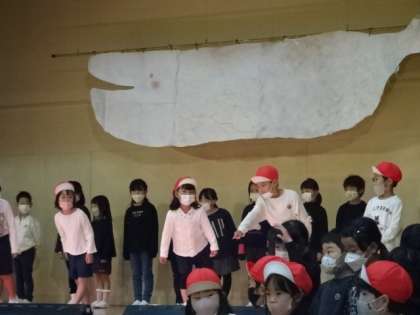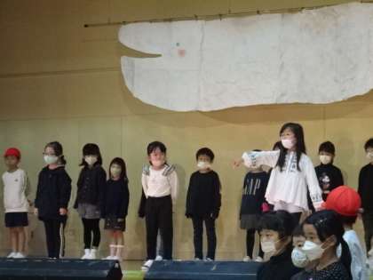 国語で学習した「くじらぐも」のお話をピアノの音楽にのせて、せりふや歌で表現しました。初めての学習発表会でしたが、自分たちでタイミングをそろえて場所を移動し、全員がそれぞれの役割を一生懸命に取り組むことが出来ました。