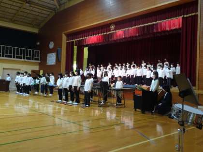はじめに演奏で使う楽器の特徴を紹介し、それぞれの楽器が合わさって奏でる音楽を聴いていただきました。ぎりぎりまで調整が必要でしたが、これまでで一番の素晴らしい演奏ができました。みんなの気持ちが一つになり、♪ギャラクシーと♪アフリカンシンフォニーの2曲を演奏し、子どもたちも大満足でした。あまりに素晴らしいので、宇多野小学校50周年式典のオープニングを5年生の演奏で飾ってもらうことになりました。
