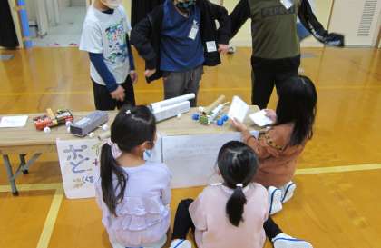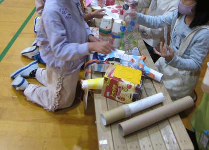 会場の体育館には2年生が工夫して作ったおもちゃコーナーがたくさんありました。1年生は好きなコーナーを回っておもちゃ遊びを楽しみました。