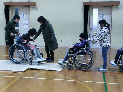 車椅子をたくさん借りてきていただき、コース設営までしていただいたおかげで、十分に子どもたちが車いすに乗ったり押したりする体験をすることができました。