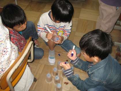 「秋の木の実や落ち葉を使ってどんなことができるかな?」と子ども達に呼びかけ,どんなことができるかアイデアを出し合いました。