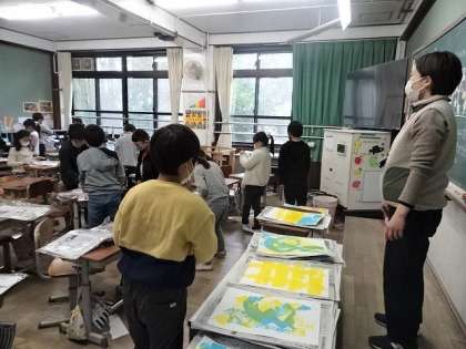 2年生はローラー版画をしていました。裏がシールになっている紙版を切り取って貼って刷ってを繰り返し、色の重なりを楽しむ版画です。パーツが細かいので片付けが大変そうでした。