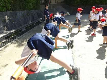 「めがねの手」で鉄棒をしっかりと握り、体を支える練習をしています。それができたらいろいろな技が出来るようになりますよ。今日は、「こうもり」や「地球まわり」などの技に挑戦していました。