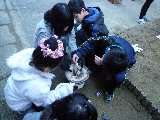 炭がいこってきたら、あみを置いてもちを焼きました。火加減が難しくて、なかなか焼けなかったり、焦げてしまったりといろいろでしたが、しょうゆをつけて食べると、みんな「おいしかった!」の声。