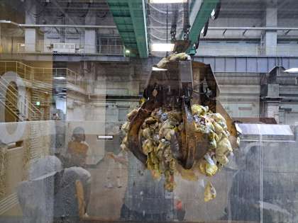 貯留槽にたまったごみを焼却炉に移すクレーンは一度に収集車2台分、重さ3、4トンものごみをつかむそうです。ごみをわしづかみにする巨大クレーンは迫力満点です。