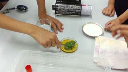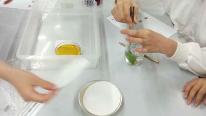 6年生の理科では,ジャガイモの葉に含まれる成分についての実験をしました。葉を熱湯で煮て水で洗い,ヨウ素液につけました。するとアルミホイルをかぶせた葉は色の変化がなく,アルミホイルをかぶせない葉は黒っぽくなり,葉の中にでんぷんが含まれることが分かりました。