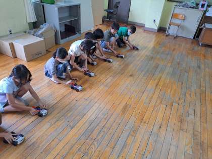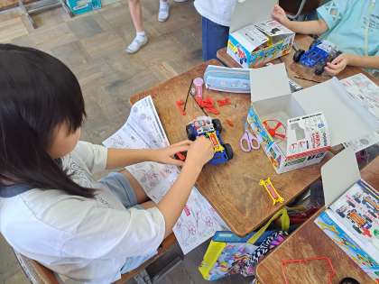理科では、電気の働きについて学習をしています。電池のつなぎ方によって電流の大きさが変わることを学びました。学習の最後には電池をつないでモーターカーを走らせました。