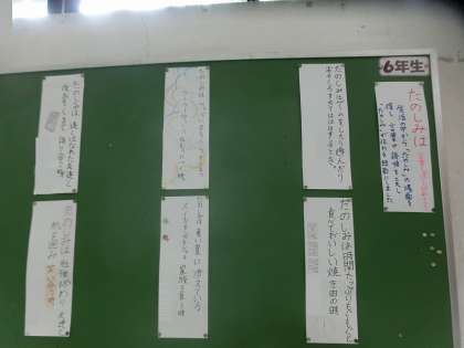 6年生の学年掲示板に、国語科の学習で取り組んだ短歌が掲示されていました。