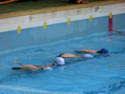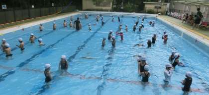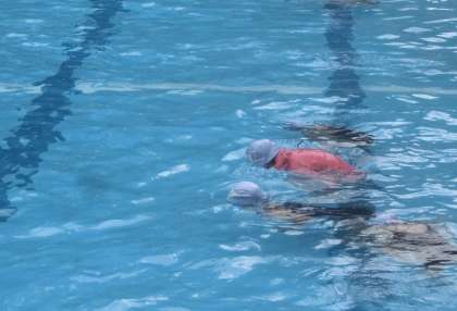 ダルマ浮きをしたり、もぐってじゃんけんをしたりして、水なれをしています。