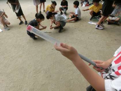 空気は押し縮めることができて、その力で物を動かすことができます。水は押し縮めることができません。このことを利用して、栓を飛ばす実験をしました。