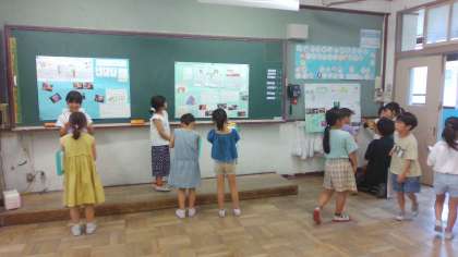 生活科のまちたんけん発表会をしました。グループに分かれて調べたことや気がついたことをポスターセッションで発表しました。どのグループもそれぞれにまとめ方を工夫していて上手に話すことができていました。感想や質問からさらに話が膨らんでいるグループもありました。