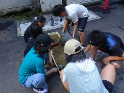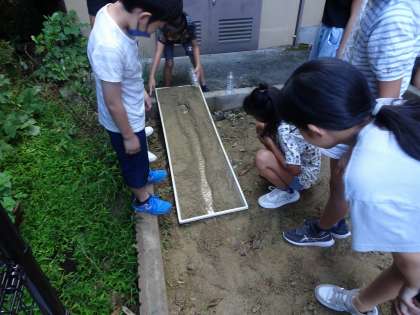 理科の「流れる水のはたらき」の学習で、実験を行いました。 上流から下流までを自分たちで作って、水を流して様子を観察しました。