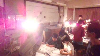 6年生の理科で月の見え方と太陽の位置関係を学習しています。お天気や時間帯の関係で,なかなか実際の月は見ることができないので,暗くした理科室でモデルを使って実験をしました。明るめのライトが太陽で,球形の発泡スチロールが月です。自分を地球から月を見る人に見立てていろいろな角度から月を見て,三日月や満月,新月などのときの月と太陽の位置関係を確認しました。