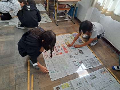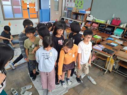 算数では、面積の学習をしています。新聞紙を使って1平方メートルを作りました。何人乗れるか試したところ12〜13人は乗れそうです。1平方センチメートルと比べると1万倍の大きさにあたることを体感していました。