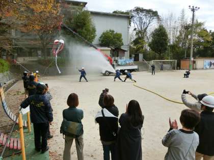 開会式の後、3つのグループに分かれて、搬送訓練、避難所設営訓練、火災訓練が行われました。今年は、子ども用消防車のブースも設けられました。また、閉会式では、宇多野消防分団の皆さんが放水でくす玉を割られました。