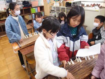 そして、みんなで「さくら さくら」に挑戦しました。この曲は親指につけたつめだけで弾くことができ、弦の番号もわかりやすく、子ども達同士でアドバイスもしながら演奏することができました。