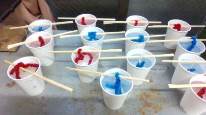 食塩の結晶作りは,事前にある程度作り方の流れを調べてからのスタートです。色付きのモールを好きな形にして,割りばしにつけて,飽和食塩水に沈めます。すぐには結果が出ず1〜2週間そのままにする必要があります。子どもたちは理科の時間などに観察する予定です。大きな結晶ができるといいですね!
