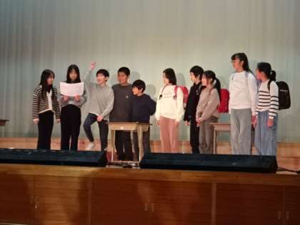 6年間の学習を活かして、感謝の気持ちや防災の大切さなどを見ている人に伝えられるように、身振りや手ぶり、セリフの言い方などを工夫して発表していました。修学旅行や総合的な学習の時間などに学習したことが随所にちりばめられていて、6年生が学習してきたことがよくわかりました。