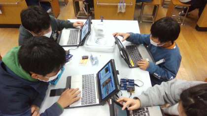 6年生の理科では「電気を効率的に使うには,どのようにしたらよいか?」という考えのもと,プログラミングに取り組んでいます。豆電球やLEDの回路を使う場合と,プログラミングキットだけを使う場合とがありますが,回路を使う場合が特に難しいようです。