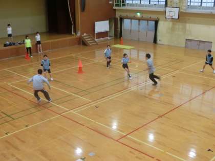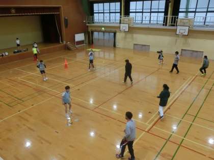 陸上部の6年生と教職員とで「スポーツおにごっこ」を行いました。このおにごっこは普通のおにごっことちがうところがいくつかあります。例えば、相手陣地のコーンを取って得点とします。チームで作戦を立てない勝てません。6年生が見事なチームワークで、教職員チームを翻弄していました。教職員チームもだんだんと熱くなっていく様子が面白かったです。楽しいお別れ試合ができました。