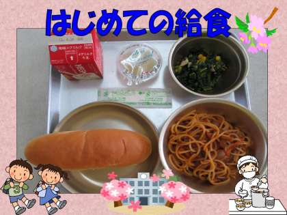 1年生は,はじめての給食です。エプロン・マスク・帽子をつけて給食当番や後片付けもしました。