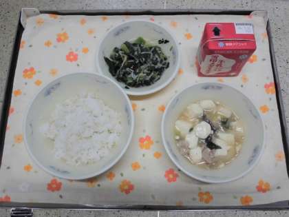 五目どうふは、豚肉・とうふ・たまねぎ・チンゲン菜の食感を楽しみながらいただきました。しいたけのもどし汁を使って具材を煮、片くり粉でとろみをつけておいしくいただきました。