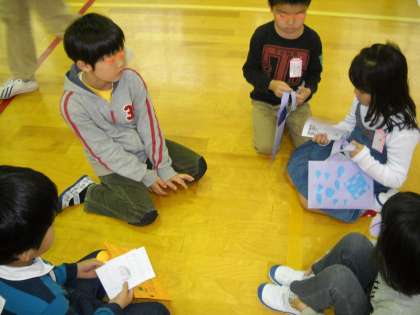 この日は,学校たんけんで一緒にまわる1年生にプレゼントと名刺を渡して,みんなでなかよく遊びました。