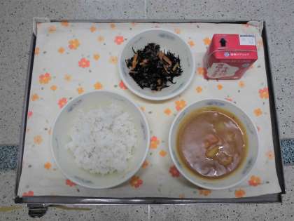 ツナとひじきのカレーソテーは、ツナのうま味がひじきや野菜にからんでおいしくいただきました。子どもたちが給食時間に見ている給食カレンダーに、作り方が掲載されていました。ぜひ、ご家庭でもお試しください。