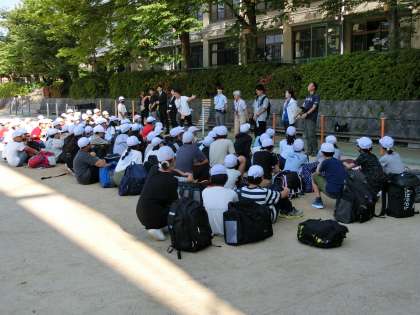 7時30分に運動場に集まった6年生は、好天の下、出発式を行いました。出発式では、児童代表の言葉の後、引率の教職員、カメラマン、旅行会社のみなさんが紹介されました。