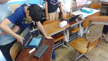 毎時間少しずつ紹介のプレゼンを加筆訂正し,読む練習もしました。そのうえで,班の中で誰のプレゼンを採用するのか,そして誰がどのページの読む担当なのかを決めて,本番を念頭に置いた練習をし,相手に見てもらいやすい机の配置や,端末を置く場所を考えたりしました。