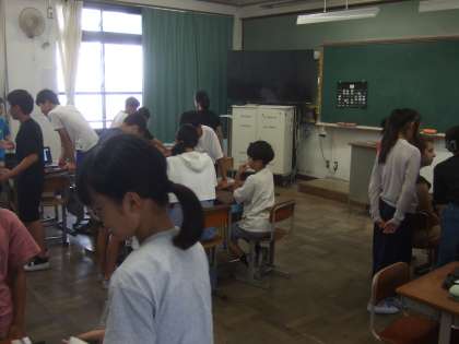 今日は宇多野ユースホステルに泊まっておられる,アメリカの中高生8人の方と交流をしました。6年生各クラスに数名ずつ入っていただき,子どもたちは「Welcome to Japan.」の単元で何度も練習したプレゼンを見せながら,日本のお祭りや行事を紹介しました。
