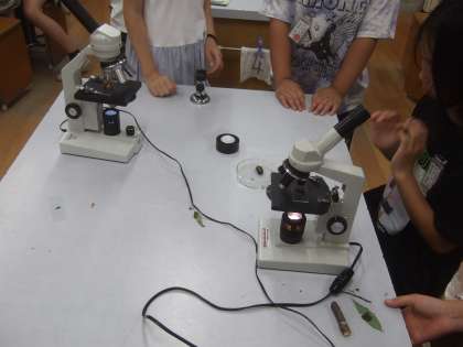 自分が外で見つけてきたものをいざ顕微鏡で見ようとすると,「先生!見えません!」という声がチラホラと。顕微鏡は下からライトの光が当たるので,見たいものに厚みがあると見えにくくなります,という説明をしてしばらくたつと「見えた!」という声があちこちからあがりました。