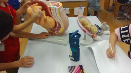 理科では「ヒトのたんじょう」の単元をしています。今日は子どもたちに,班ごとにコーナーを作ってもらってみんなで体験しました。
