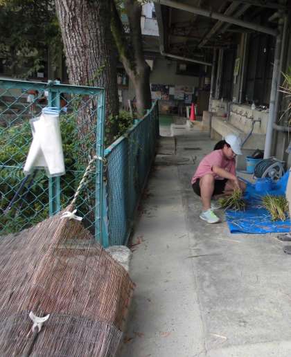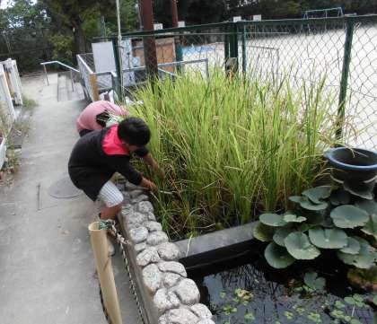 この日は5年生が校外学習でいなかったので,6年生の給食委員会児童と,6年生の有志だけになりましたが,テキパキと刈り取り,ゴムで縛り,何とか終えることができました。子どもたちは喜んで活動してくれました。しっかり干して,後日脱穀経験もしてもらおうと考えています。