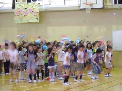 「モーニング チャチャチャ」という曲に合わせて、けん玉を披露したり、手作りのお花を揺らして歌ったりと楽しい発表でした。