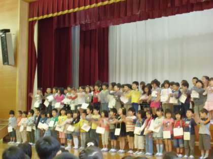 それぞれの学年から工夫を凝らした言葉や歌のプレゼントがありましたが、舞台上の長いすに,ちょこんと座った1年生達はとてもうれしそうに聞き入っていました。