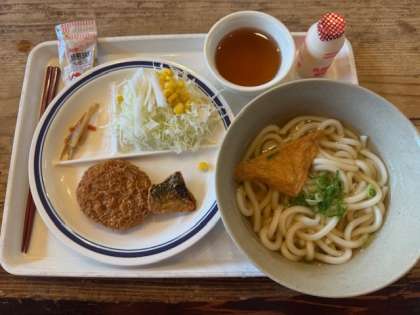 メインがきつねうどんで、ミンチカツ、サバの竜田揚げ、きんぴらごぼう、金時豆などを選んで食べました。