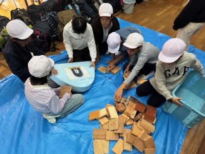 2つの班で協力して、気のブロックを積み上げ、アーチを作ります。