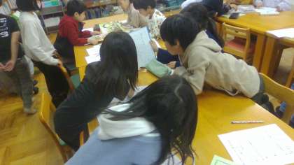 子どもたちは、班で協力してどの分類にあるのか、どのページにあるのかを探しました。