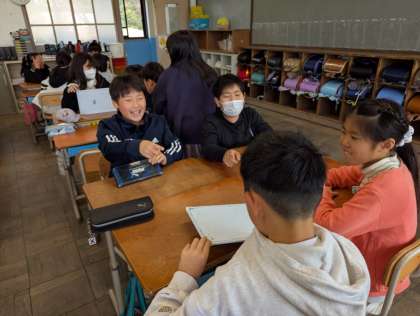国語の最初の単元の「ひみつの言葉を引き出そう」をしました。親になる子に見えないように“ひみつの言葉”を決め、会話の中でその言葉を引き出すという学習です。あっという間に“ひみつの言葉”を引き出すグループもあれば、試行錯誤してどうにか引き出そうとしているグループもありました。どのグループも会話が弾んでいて大盛り上がりでした。中間休みにも他の子とチャレンジしている子もいました。