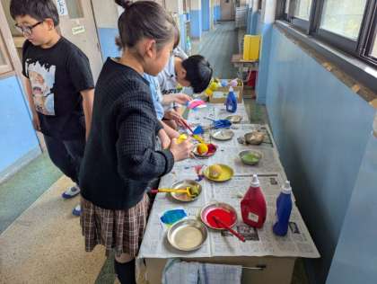 図工の時間に『心のもよう』という題材で、正方形の紙に絵の具を使って様々な模様を描きました。絵の具の色や水の量を調整して濃淡をつけたり、ローラーや刷毛など筆以外のものを使ったり、スパッタリングや吹き流しなどの技法を試したりたくさん工夫して表現していきました。そのできた模様がどんな気持ちを表しているのか考え、色や形によって気持ちを表現することができること、また、人によっても感じ方が違うことにも気づきました。すてきな“心のもよう”が出来上がりました。、